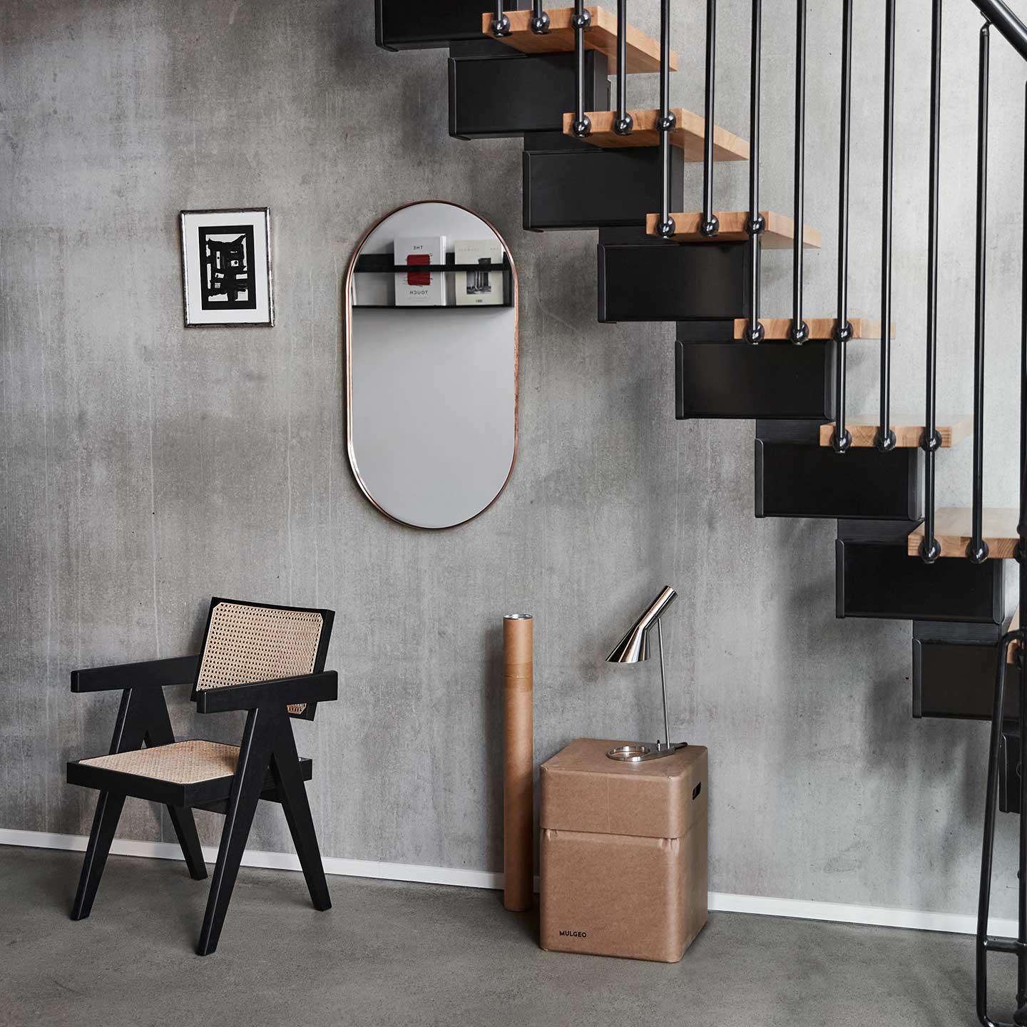 Vælg mellem massiv Messing, Kobber eller Sort Metalramme til dit ovale spejl.
