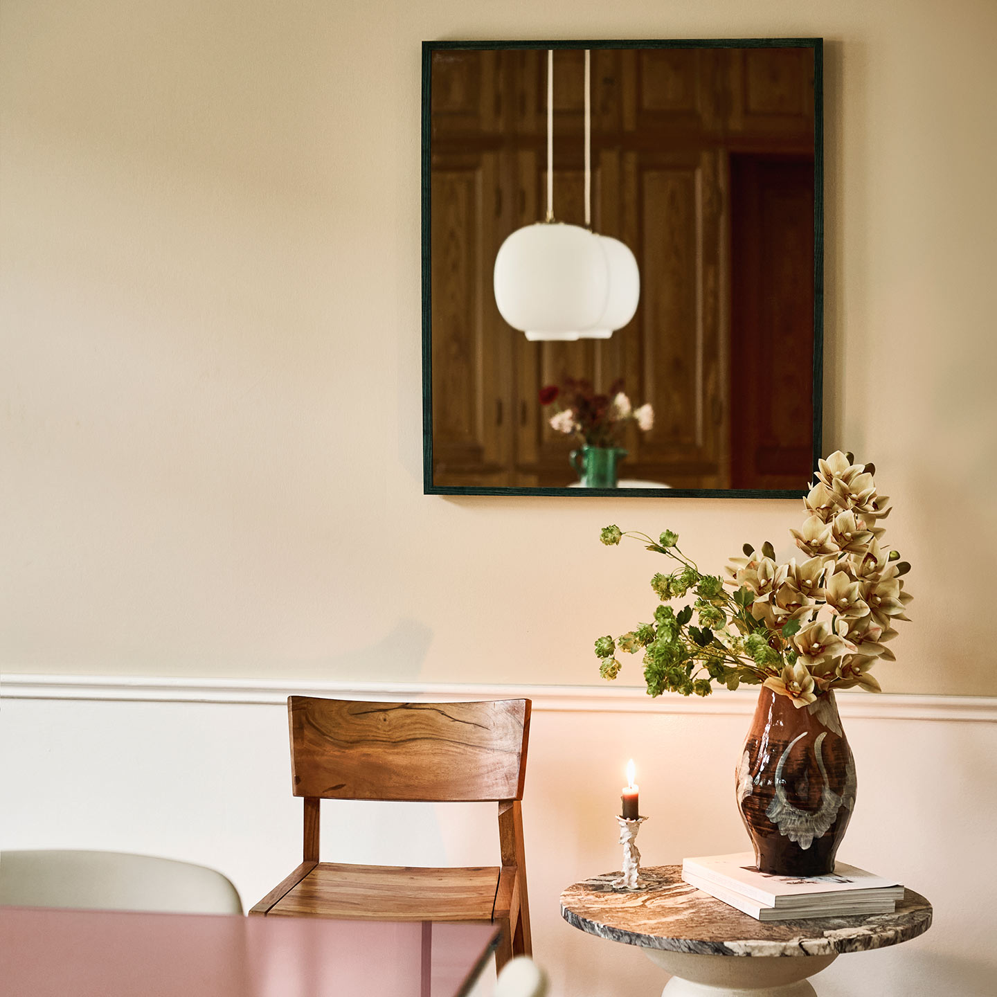 Spejlet i grønolieret ask ramme i spisestue miljøet måler B70xH80 cm, hvor spejlet i mørk eg ramme i entreen måler B60xH110 cm.